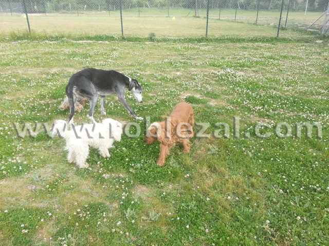 Galgo alojado en nuestra residencia canina, con otros perros.